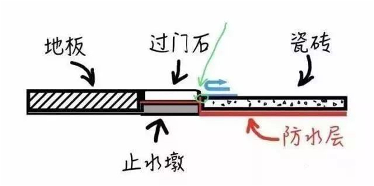 我们知道,如果是后期铺贴门槛石,门槛石就会和止水墩之间存在一定的缝隙,随着时间的推移,由于卫生间的用水量比较大,地砖下面的防水层上方