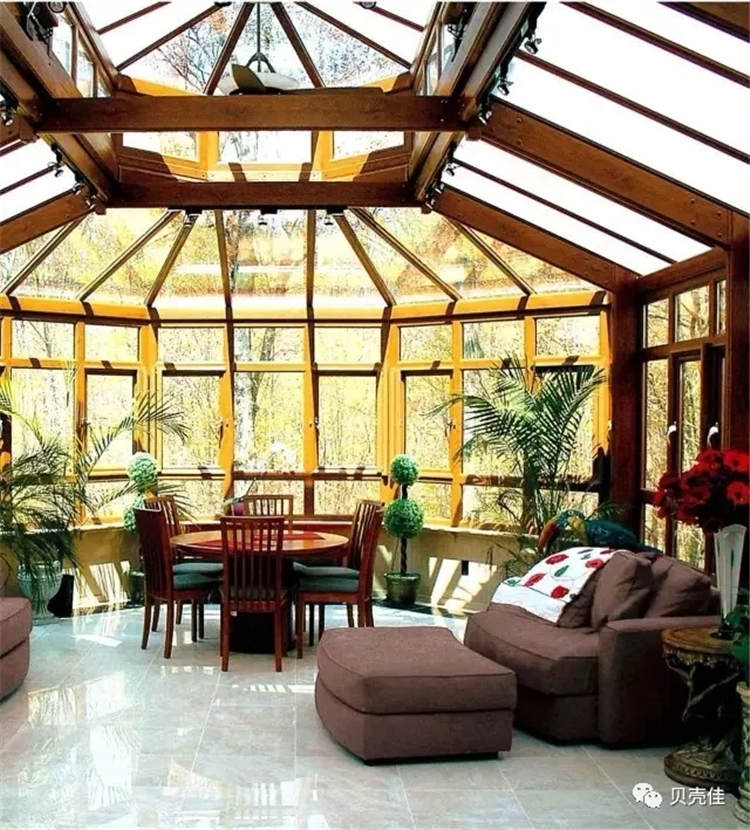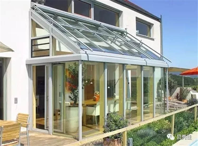 3、阳光房不同于门窗,是由整体框架结构形成的,框架不牢固会影响阳光房的使用寿命,而阳光房顶部一般都是玻璃,受力较大,不牢固的框架在玻璃的压力下,会导致阳光房整体轻微变形,因此,建议客户不要贪便宜,宁愿多花一点钱用好一点的框架材料。阳光房的透明材料很多,也是阳光房透光的必需配料,现在市场上有钢化玻璃,夹胶玻璃,耐力板,阳光板(中空板),都可以满足采光的要求,但是每一种透光材料都有利弊之别。