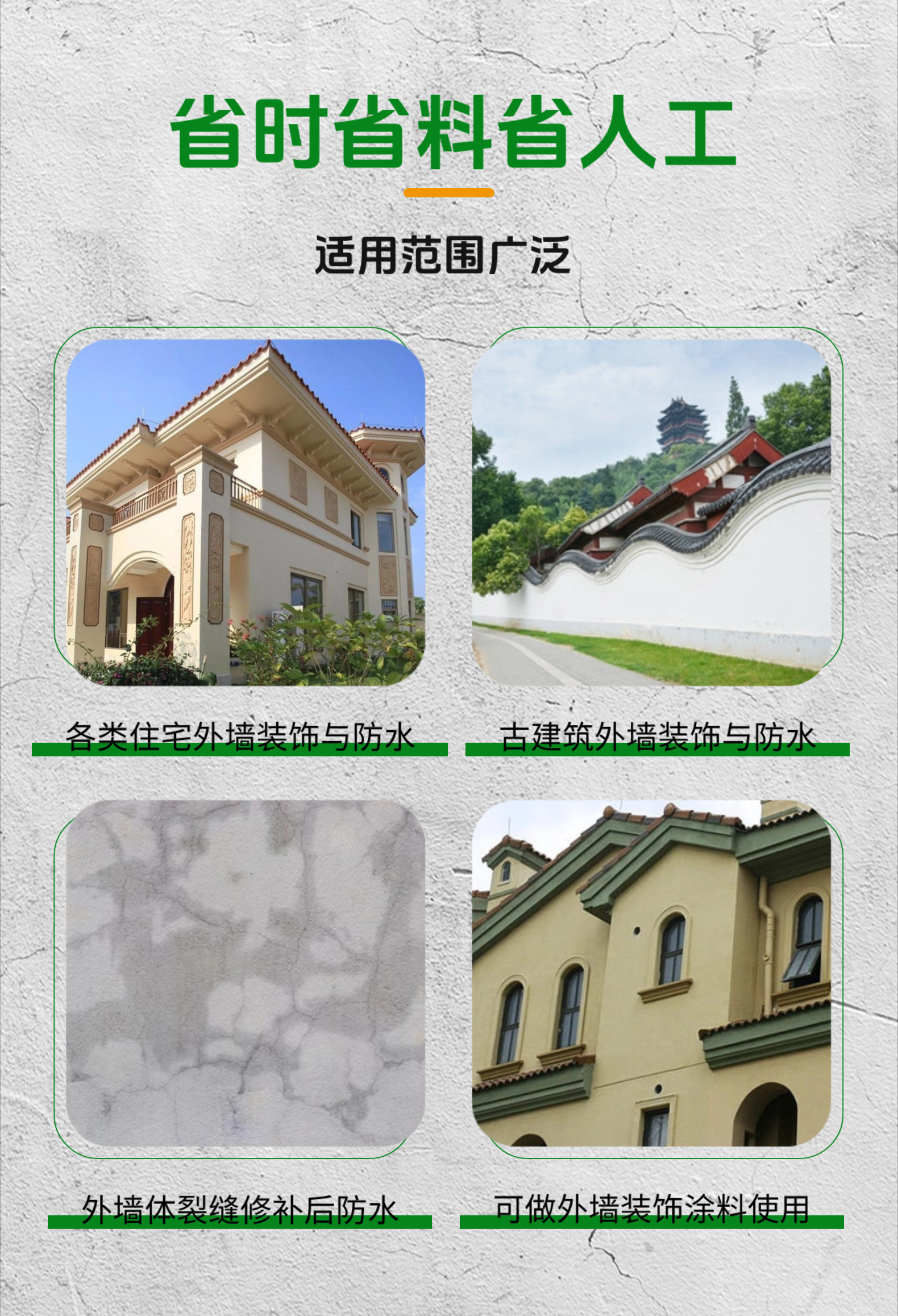 传统外墙装修往往要分多步:先做基层防水,再刷底漆、面漆,想要仿石、仿砖等质感,还得额外做造型,不仅施工周期长,各环节衔接不当还容易留下隐患——比如防水层与装饰层剥离,用不了几年就出现起皮、渗漏。